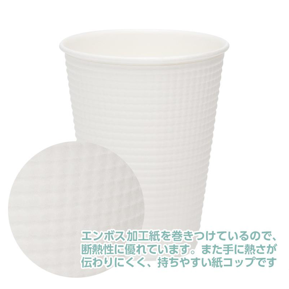 内カップに凹凸紙を巻き付けて空気層をつくり、外面に熱を伝えにくく手に持って熱さを感じにくい紙コップです。