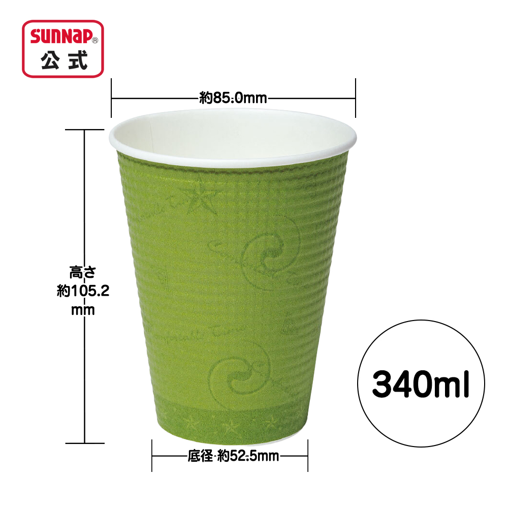 内カップに凹凸紙を巻き付けて空気層をつくり、外面に熱を伝えにくく手に持って熱さを感じにくい紙コップです。