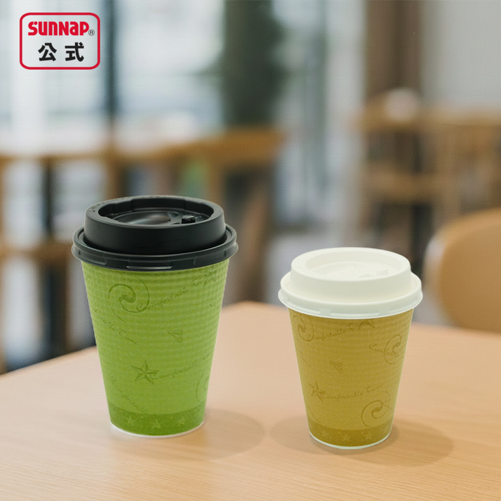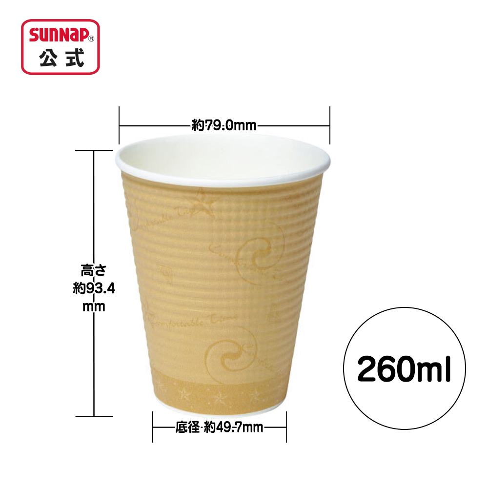 内カップに凹凸紙を巻き付けて空気層をつくり、外面に熱を伝えにくく手に持って熱さを感じにくい紙コップです。