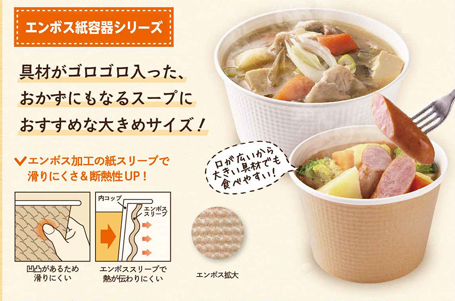 凹凸のあるエンボス紙を巻いてあるので、カップとスリーブの間に生じる空気層が内容物の熱をダイレクトに伝わるのを和らげます。また、エンボス加工で持ったときに滑りにくくなっています。