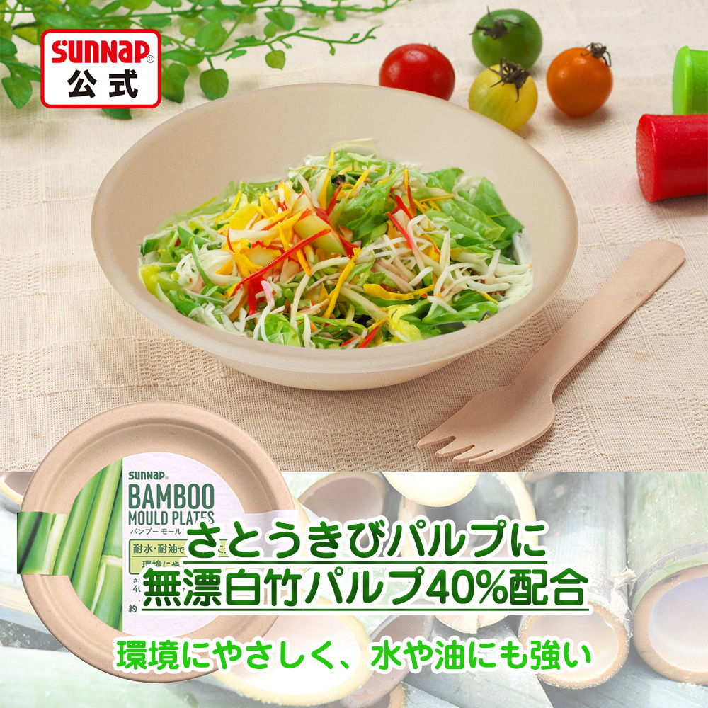 モールドとは型から作られている紙皿で、板紙で出来ている紙皿に比べ強度があり、たわみが少なくボリューム料理に好適です。
